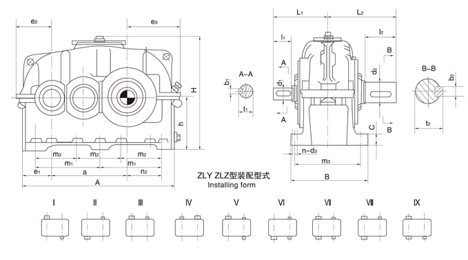 ZLY硬齒面齒輪減速機速比有:6.3,7.1,8,9,10,11.2,12.5,14,16,18,20 九種裝配型式,兩種旋向,順時針S,逆時針N,